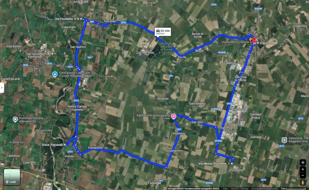 L’itinerario è ad anello, da chiudere ritornando nei pressi del comune di Colorno. È facilmente percorribile in automobile, su strade comode e adatte a qualsiasi tipologia di macchina.