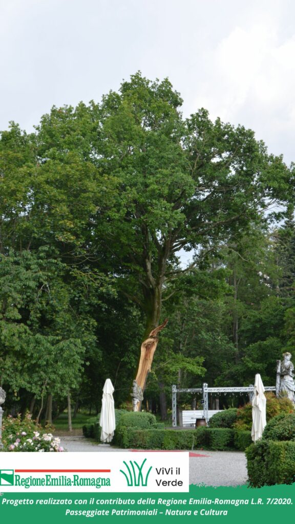 Vicino all’edificio nella zona nord est è presente un enorme esemplare di quercia autoctona, una roverella di elevate dimensioni. Anche questo esemplare si stima abbia più di 100 anni di età. Purtroppo, un paio di anni fa ha subito un importante incidente durante un temporale con forte vento che ha rotto una porzione di chioma, fortunatamente non recando altri danni. Tuttavia, grazie all’intervento immediato di arboricoltori e grazie alla sensibilità della proprietà, si è riusciti a eliminare solo la porzione di chioma irrimediabilmente compromessa e null’altro. Ora la pianta ha una gestione specifica, per limitare lo stress e aiutarla nel processo di rimarginazione della ferita.