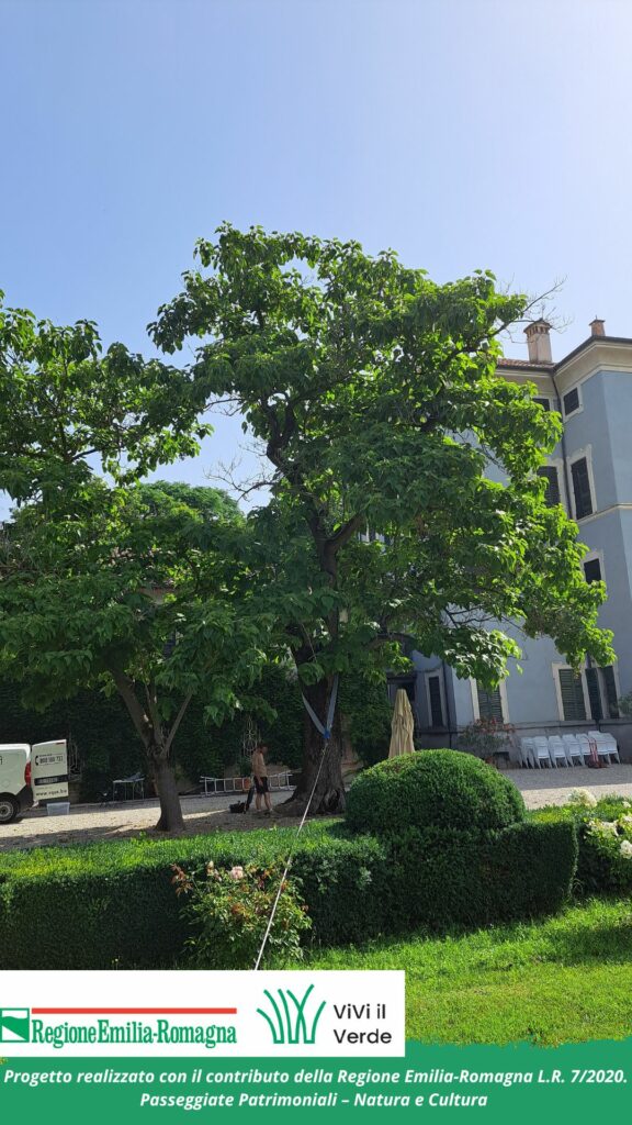 Specie originaria della zona temperata boreale (Europa, Nord America e Asia), inserita in questo contesto probabilmente intorno alla fine del 1800 quando è stato ampliato il parco della Villa. Questo esemplare, di notevoli dimensioni, e quindi parecchi anni di età, è una delle piante di pregio della villa. Grazie alla sua posizione (a fianco dell’edificio) e della sua imponenza è una delle più identificative del parco. Essendo un esemplare centenario è stata oggetto di analisi per valutare la sua stabilità, come altre alberature di pregio della villa. Sono state eseguite anche pulling test, da un’azienda specializzata in arboricoltura per alberi di pregio, per studiare come l’esemplare risponde alle sollecitazioni degli eventi atmosferici.