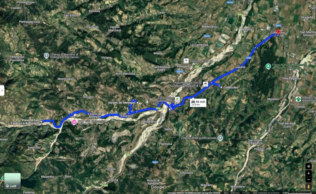 L’itinerario prende vita dalla Pieve di Serravalle dedicata a San Lorenzo, che con il suo particolare battistero scorge il panorama lungo parte del Fiume Ceno. Documentata fin dal 1005, è una delle più antiche pievi del parmense, nonché la sola ad avere un edificio apposito per la celebrazione del battesimo. La chiesa, demolita da un terremoto, è stata ricostruita completamente nel XIV secolo e rimaneggiata tra il 1796 e il 1927. L’elemento di maggior interesse del complesso è il battistero, risalente al X-XI secolo, con una caratteristica pianta ottagonale simbolo del passaggio dalla vita terrena a quella ultraterrena, secondo la tradizione di Sant’Ambrogio. La struttura in pietra squadrata conserva gran parte del materiale originale, con una copertura restaurata. All’interno si trovano decorazioni sobrie, tra cui capitelli con simboli legati agli evangelisti, e un altare con sostegni di epoca longobarda, decorati da eleganti motivi vegetali.